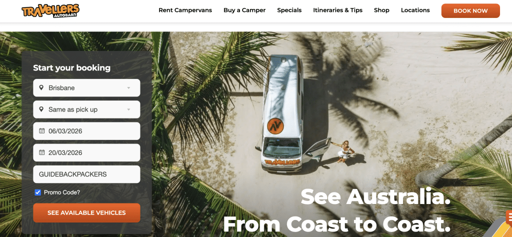 Grâce à notre code promo, bénéficiez de 5% de réduction sur la location d’un véhicule. Il vous suffit d’entrer le code promo GUIDEBACKPACKERS lorsque vous faites votre réservation sur le site de Travellers Autobarn.