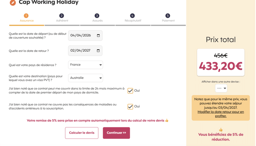 CAP Working Holiday : Le contrat qui vous protège pendant votre permis Vacances-Travail dans l’un des pays partenaires avec la France (Australie, Canada, Japon, Nouvelle-Zélande, Argentine, Brésil, Chili, Colombie, Mexique, Uruguay, Taïwan, Hong-Kong ou Corée du Sud)
