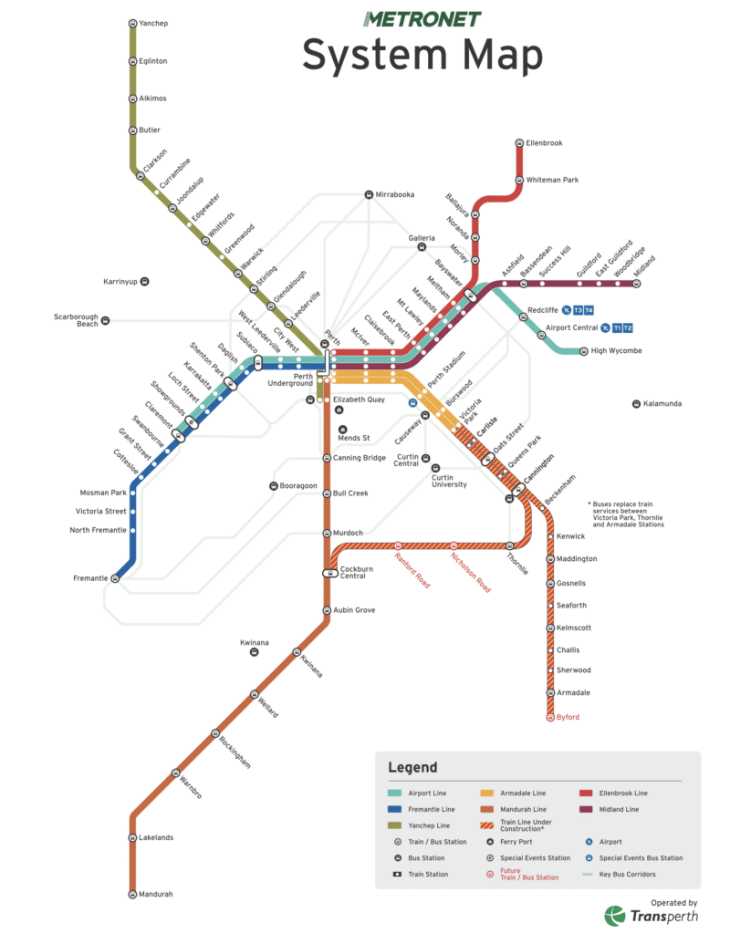 Comme pour le bus, différentes lignes permettent de découvrir la ville et ses environs. En centre-ville, se trouve une zone où les trains circulent gratuitement entre City West et Claisebrook. Cependant, vous devez utiliser la carte SmartRider pour bénéficier de la gratuité.